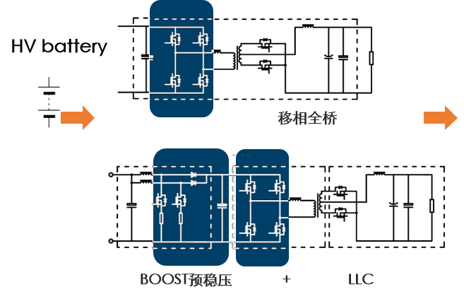 DC/DC轉換器用于將電池高壓轉換為12/24V車用電壓為全車電控提供電能。采用SiC器件所設計的DC/DC轉換器具有更高的工作頻率,更低的開關損耗,有效降低轉換器體積。SiC器件更小的導通電阻及開關損耗降低電能損耗,提升轉換器工作效率。